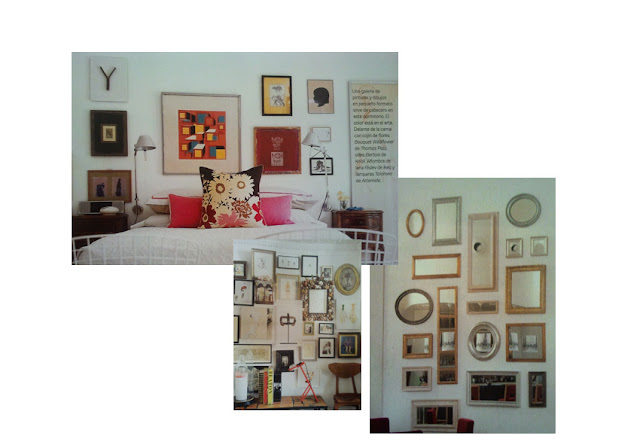 De hace un tiempo a esta parte vengo observando en las revistas de decoración a las que soy adicta, que ya nadie se molesta en medir a la hora de colgar un cuadro. Parece que cada uno se coloca donde primero se pilla y que no se sigue ningún criterio a la hora de mezclar materiales, colores, motivos y tamaños. Lo que, en principio, me pareció una locura del decorador de turno, me ha ido gustando más y más, hasta tal punto, que he decidido llenar las paredes de mi casa con algunas composiciones siguiendo esa "falta de criterio", jeje.