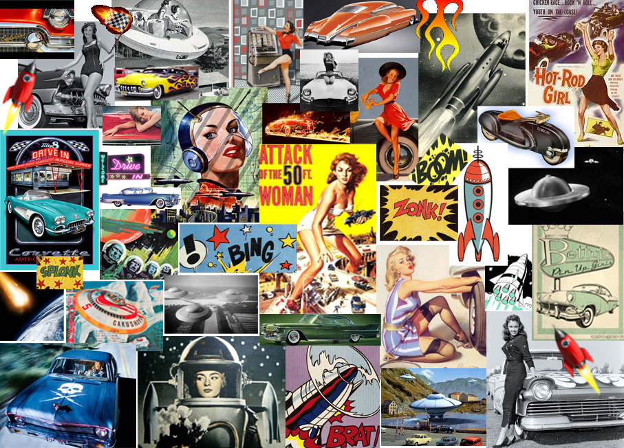 Esta vez, la heredera del imperio Prada, ha metido en la coctelera todos los elementos del imaginario freak cincuentero: cochecitos de carreras, llamaradas, comics, retrofuturismo, pin-ups, autocines, cohetitos espaciales, lluvia de meteoritos, explosiones, su poquito de cine serie B y...voilá! De repente, lo que siempre le ha gustado a los freakies es chic!! Se obró el milagro!! (clic)